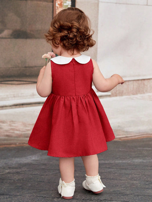 فستان بسيط للفتيات الرضع بعنق دمية وخصر مطاطي اللون يحتوي على رباط وتصميم مجسّم بألوان مختلفة