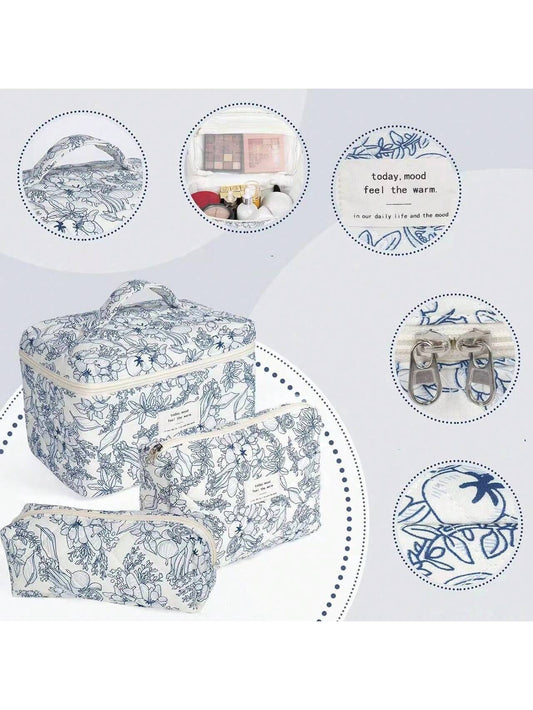 مجموعة من 3 حقائب مكياج مبطنة بطبعة الزهور، حقيبة مكياج جمالية لتنظيم الأدوات الصحية أثناء السفر، هدية للنساء والفتيات، تخزين متنقل للمكياج والحاجيات الخاصة، حقيبة تنظيم المكياج
