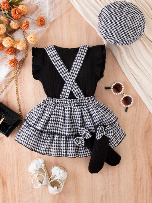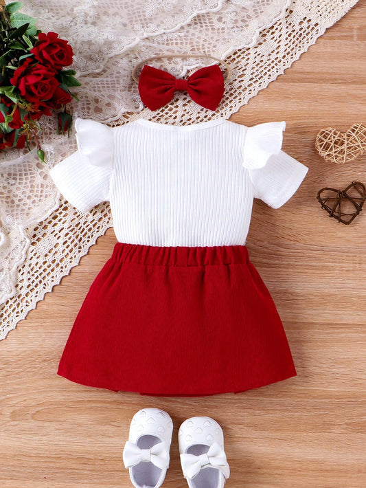 مجموعة جميلة لأنثى الرضع تتألف من بلوزة بحواف بكمات وتنورة مع تزيين عقدة الحزام، مناسبه لفصل الصيف